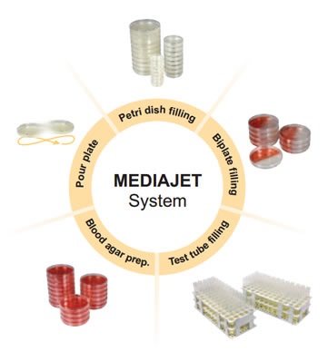 The MEDIAJET system offers the unique flexibility to fill Petri dishes of various sizes, Petri dishes with two compartments as well as test tubes of various diameters and length. At the same time, MEDIAJET requires only minimal bench space in the laboratory. MEDIAJET is the perfect complementation to the INTEGRA MEDIACLAVE media preparator range as it allows the continuous filling of up to thirty litres media into Petri dishes.
