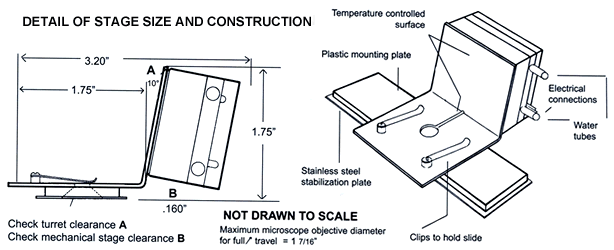 The Stage is nickel-plated copper, with a thermoelectric module mounted on one side (see diagram). The plastic base is the same size and thickness as a glass slide and fits onto the mechanical stage of the microscope in the same manner as a slide. The thermal stage can therefore be moved relative to the optics by the normal mechanical stage controls. A hole in the metal plate permits the use of transmitted light.