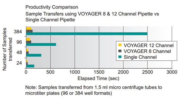 The VOYAGER pipette significantly increases productivity by allowing users to transfer multiple samples simultaneously. This also greatly reduces transcription errors as the number of transfers is minimized. The adjacent chart clearly highlights the productivity gains. For example, 96 samples can be transferred from a 1.5 ml tube to a 96 well plate in one minute using a 12 channel VOYAGER pipette. Compare this to the ten minutes it requires to transfer 96 samples using a single channel pipette.
