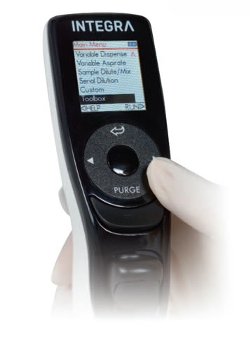 Same as all INTEGRA electronic pipettes; VOYAGER pipettes feature a color screen and proven touch wheel user interface for quick and comprehensive menu navigation. Simply by moving a finger over the touch wheel, menus and settings can be accessed. All menus are spelled out on the clear to read screen making memorizing abbreviations unnecessary.