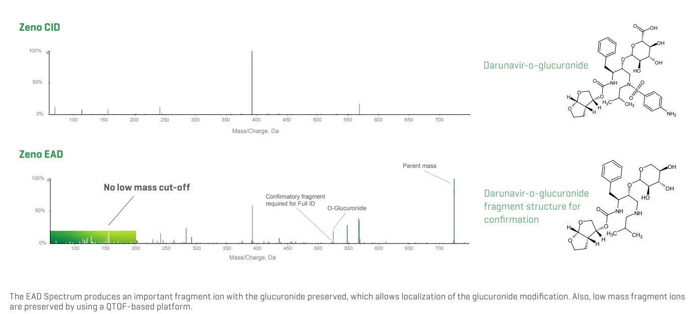 The ability to tune electron kinetic energy extends the utility of the approach to all molecule types, from singly charged small molecules to large multiply charged proteins. EAD allows for a range of reagent-free electron-based fragmentation mechanisms with a single device, and it has the capability to fragment peptides while retaining critical MS/MS information for both identification and localization of PTMs. Unlike other electron based fragmentation techniques, EAD delivers reproducible, consistent data, even at fast scan speeds, and it is compatible with UHPLC time frames, delivering higher efficiency than electron-transfer dissociation (ETD). In this instrument, geometry coupling EAD with the Zeno trap allows for detection of very low abundant diagnostic fragment ion species, leading to greater sequence coverage.