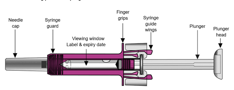 Put the used pre-filled syringe in a sharps disposal container (i.e. a puncture-resistant closable container, or similar) immediately after use.