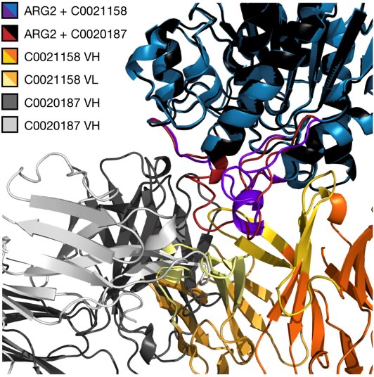 Complete inhibition of ARG2 is achieved by the affinity-matured antibody C0021158 (Figure 1B), which also successfully restores T-cell proliferation in vitro. The lack of overlap between the epitope and the substrate binding cleft suggests an allosteric mechanism. When C0021158 binds, ARG2 experiences significant confirmational changes.