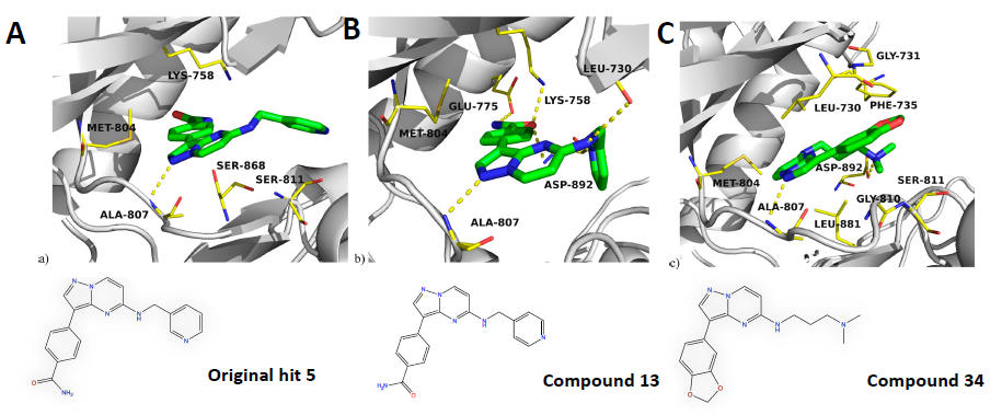 Figure 1. A) Docked model of early hit 5 bound to RETV804M. (B) Crystal structure of 13 bound to RETV804M (PDB 6I83). (C) Crystal structure of optimized lead 34 bound to RETV804M (PDB 6I82). In all panels, RETV804M is shown as grey cartoons, key residues as yellow sticks, and the respective ligand as green sticks.