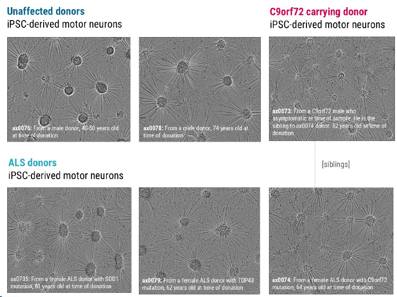 Here, we demonstrate the successful characterization of axoCellsTM human iPSC-derived motor neurons from six different donor lines including two unaffected donors, one C9orf72 carrying donor (the sibling to the C9orf72 ALS donor), and three donors each carrying significant genotypes associated with ALS; SOD1, C9orf72 and TDP43 for ALS drug discovery.