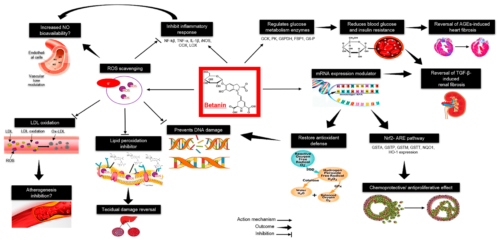 Health effects of betanin: A summary of molecular and metabolic targets of betanin reported in cell cultures and animal models. AGEs, advanced glycation end products; C, carbon; COX, cyclooxygenase; DNA, deoxyribonucleic acid; FBP1, fructose-bisphosphatase 1; G6-P, glucose 6-phosphate; G6PDH, glucose-6-phosphate dehydrogenase; GCK, glucokinase; GPx, glutathione peroxidase; GSTA, glutathione S-transferases A; GSTM, glutathione S-transferases M; GSTP, glutathione S-transferases P; GSTT, glutathione S-transferases T; H, hydrogen; H2O2, hydrogen peroxide; IL-1β, interleukin 1 beta; HO-1, heme oxygenase-1; iNOS, inducible nitric oxide synthase; LDL, low-density lipoprotein; LOX; lipoxygenase; mRNA, messenger ribonucleic acid; N, nitrogen; NF-Κβ, nuclear factor kappa beta; NQO1, quinone dehydrogenase 1; NO, nitric oxide; Nrf2-ARE, nuclear factor erythroid 2-antioxidant responsive element; O, oxygen; O2•−, superoxide anion; OH, hydroxyl radical; Ox-LDL, oxidized low-density lipoprotein; PK, pyruvate kinase; ROS, reactive oxygen species; SOD, superoxide dismutase; TGF-β, transforming growth factor beta; TNF-α, tumor necrosis factor alpha.2