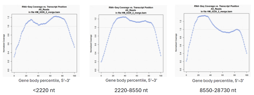 Left: For transcripts of up to 2220 nucleotides (nt), MobiuSCOPE showed even gene body coverage from 5’ to 3’ end. Middle: Similarly, for transcripts ranging from 2220 to 8550 nt, MobiuSCOPE is able to cover the entire transcript. Right: For large transcripts with more than 8550 nt, MobiuSCOPE still shows full gene body coverage, with a dip in coverage in the middle of the transcript. Image Credit: Image courtesy of Marisa Amato, in partnership with ELRIG (UK) Ltd.