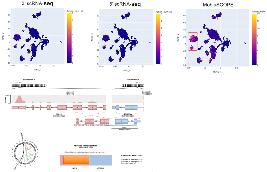 Figure 3. MobiuSCOPE detected HLA-C_LRRC74A gene fusion with high sensitivity. A PBMC sample from a patient was processed with the MobiuSCOPE method to generate full-length single-cell RNA sequencing data.