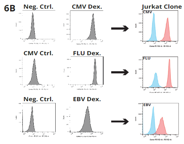 Figure 6B. Jurkat Reporter Clone staining with peptide-specific dextramer (CMV, FLU and EBV). FACS results show positive staining of Jurkat clone expressing peptide-specific TCR. Image Credit: Image courtesy of Alex Chenchik et al., in partnership with ELRIG (UK) Ltd.