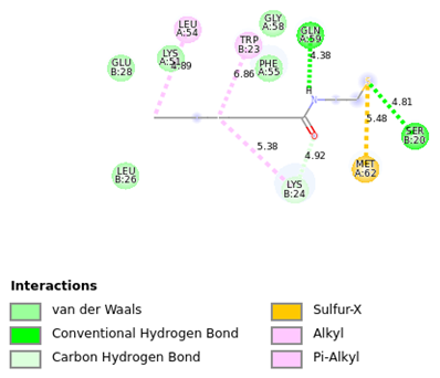 - Octanamide, n-(2-mercaptoethyl)- showed key interactions including hydrogen bonds (TRP B:23, GLU B:28, LYS B:24) and hydrophobic contacts within the p53-binding pocket. ( Figure 5)