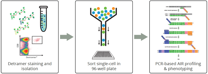 • Single-cell AIR profiling allows one to obtain chain-pairing information and a gene expression profile of each cell type.