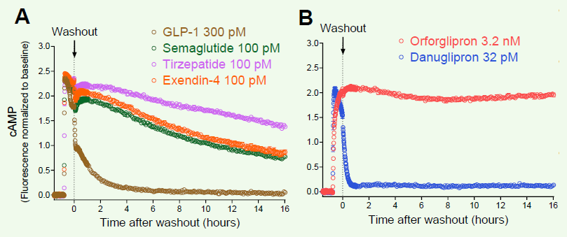 • For the small molecules (B) orforglipron signaling was completely wash-resistant, whereas danuglipron signaling declined rapidly, suggesting different receptor binding and regulation mechanisms.