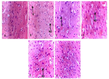 Fig. 1. Photomicrograph of the Cortical Sections of the Brain Showing the effect of PMCV002 after Scopolamine-induced Amnesia in Mice. (a). Distilled water group showing normal cortex (b). Scopolamine 1 mg/kg group showing severe gliosis and neuronal degeneration (c). Donepezil 5 mg/kg showing mild gliosis (G) (d). PMCV 002 at 1000 mg/kg showing mild neuronal degeneration (ND) (e). PMCV002 at 500 mg/kg showing mild neuronal degeneration (ND) (f). PMCV 002 at 250 mg/kg showing normal features. Image Credit: Image courtesy of Adedapo Adesokan et al., in partnership with ELRIG (UK) Ltd.