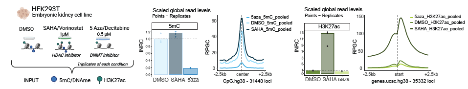 Left: Experimental setup: HEK293T cells treated with SAHA or 5-Aza (+DMSO control); triplicates of each pooled and processed. Center: 5-Aza, DNMT inhibitor reduces global DNA methylation (5mC)5mC, especially at CpG islands. Right: SAHA, HDAC inhibitor increases global H3K27ac and enrichment at TSSs.