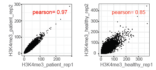Method precision: Replicate correlations of mean H3K4me3 signal (RPGC-normalized) over TSSs in plasma samples from a cancer patient (left) and a healthy donor (right). Each replicate from 0.5 ml plasma. Image Credit: Image courtesy of Banushee Kumar et al., in partnership with ELRIG (UK) Ltd.