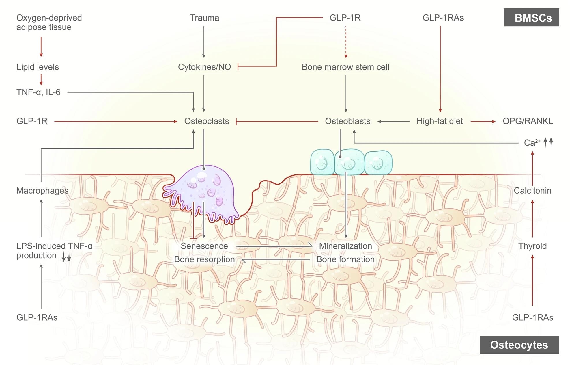 The Effects of GLP-1RAs on osteoclasts and osteoblasts. GLP-1RAs aid in weight loss by regulating the gut-brain axis and interacting with leptin, while weight loss can alleviate the harmful effects of obesity on the body, particularly in knee OA, by reducing joint loading and inflammation. Obesity disrupts bone metabolism and leads to increased bone resorption, but GLP-1RAs can inhibit this damage and improve bone health by increasing the OPG/RANKL ratio, reducing osteoclast activity, and promoting bone formation.2