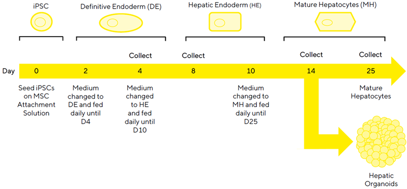 • On day 14, cells can be expanded to mature hepatocytes or extracted and cultured in a 3D matrix to create hepatic organoids. Collection timestamps are marked for characterisation analysis.