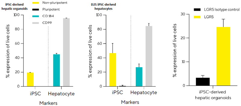• iPSC-derived hepatic organoids exhibit similar expression profiles to iPSC-derived hepatocytes, including high levels of hepatic marker CD99 and expression of CD184.