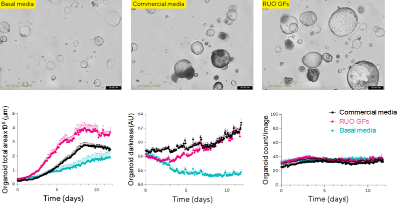 • Media containing Sartorius RUO Growth Factors and Cytokines (RUO GFs) resulted in faster growth of organoids compared to basal or commercial media.