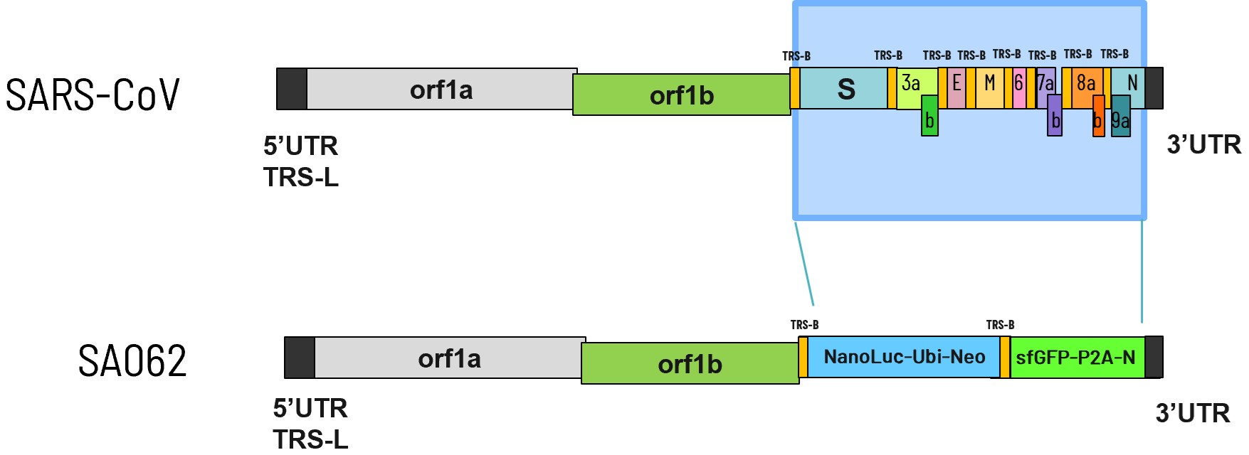 The replicon used in this work, SA062, was derived from the SARS-CoV isolate Sin2774 (AY283798). ORF1ab and all the accessory genes (ORF3a and 3b, ORF6, ORF7a and 7b, and ORF8) were retained.