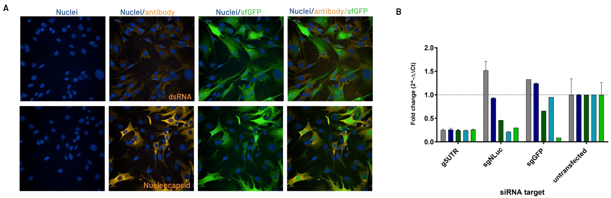 The presence of replicon RNA and the expression of viral proteins were demonstrated by detecting the presence of double-stranded RNA (dsRNA) and the Nucleocapsid protein in R484 cells (A). To validate the discontinuous transcription mechanism as a target in the cellular model, the team evaluated the effects of selectively knocking down genomic (g5'UTR) or subgenomic (sgNluc and sgGFP) RNAs using RT-qPCR (B).