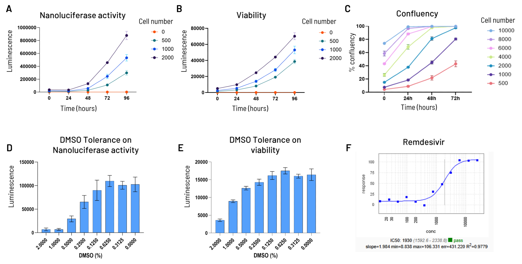 To be used in antiviral screening campaigns in a 384-well plate format, the R484 stable cellular clone was evaluated in terms of signal-to-background ratio of Nanoluciferase (A), cellular viability (B), density (C), DMSO sensitivity (D and E), and the Z-factor, and the treatment with a reference inhibitor (F).