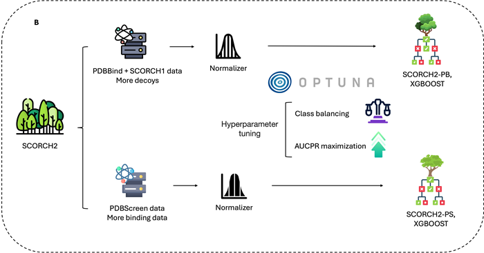 SCORCH2 uses two distinct XGBoost1 models trained on separate datasets for heterogeneous consensus scoring. Hyperparameter optimization was conducted using Optuna2, targeting AUCPR maximization for imbalanced datasets.