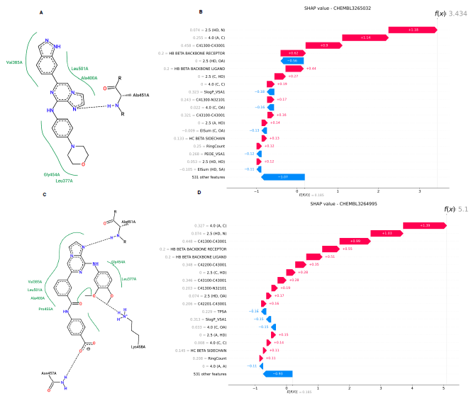 Figure 3. Analysis of molecular interactions and feature importance for two SYK inhibitors using 2D interaction diagrams and SHAP waterfall plots. (A; B) Analysis for CHEMBL3265032: 2D interaction diagram (A) and SHAP waterfall plot (B). (C; D) Analysis for CHEMBL3264995: 2D interaction diagram (C) and SHAP waterfall plot (D). In the SHAP waterfall plots, the color of each bar indicates the value of the corresponding feature (blue for lower values and red for higher values). Features are ranked by their contribution to the model’s prediction, with the most important feature at the top. Image Credit: Image courtesy of Lin Chen et al., in partnership with ELRIG (UK) Ltd.