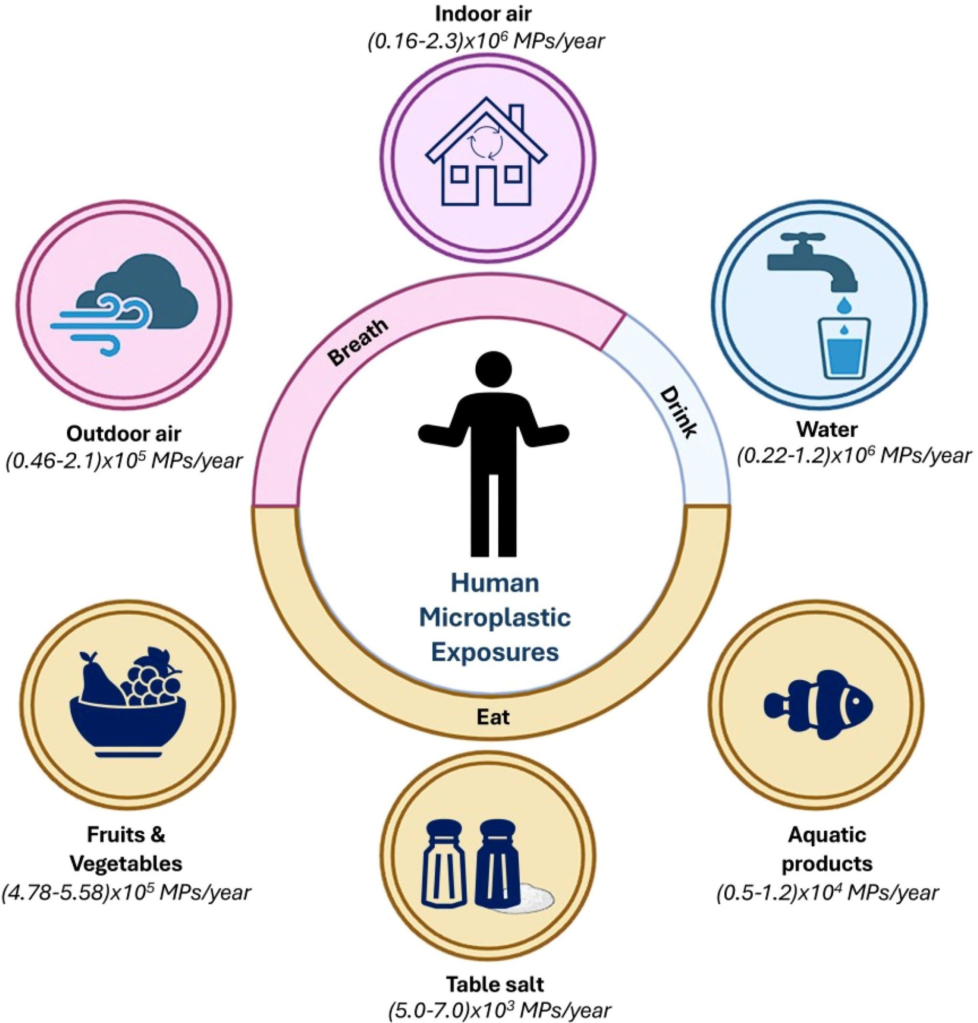 Human exposure to MPs occurs primarily through ingestion and inhalation, with some estimates suggesting that humans may ingest between 39,000 and 52,000 MPs annually from diet alone, with higher totals when inhalation is included. Contaminated food, drinking water, and airborne household dust represent the main entry routes.4