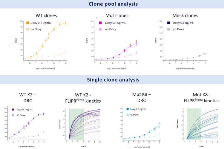 - Stable cell lines expressing wild-type (WT) and mutated TMEM175 were successfully selected using a thallium fluorescence assay and further characterized electrophysiologically. All tested clones exhibited consistent responses to the TMEM175 activator DCPIB, acidic pH, and were effectively blocked by 4-AP, with a high success rate for catch, seal, and expression.