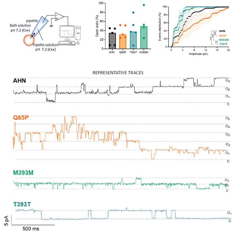 - Preliminary data (n=5) on single-channel recordings indicate a higher number of channels in Q65P compared to the other cell lines, while open probability and dwelling time parameters are higher in M393M.