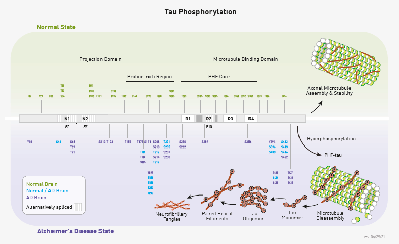 Fig. 1. Comparison of phospho-tau modifications in normal and Alzheimer’s disease states phospho-tau modifications have been mapped to the multiple locations shown here. Image Credit: Cell Signaling Technology, Inc. Used with permission.