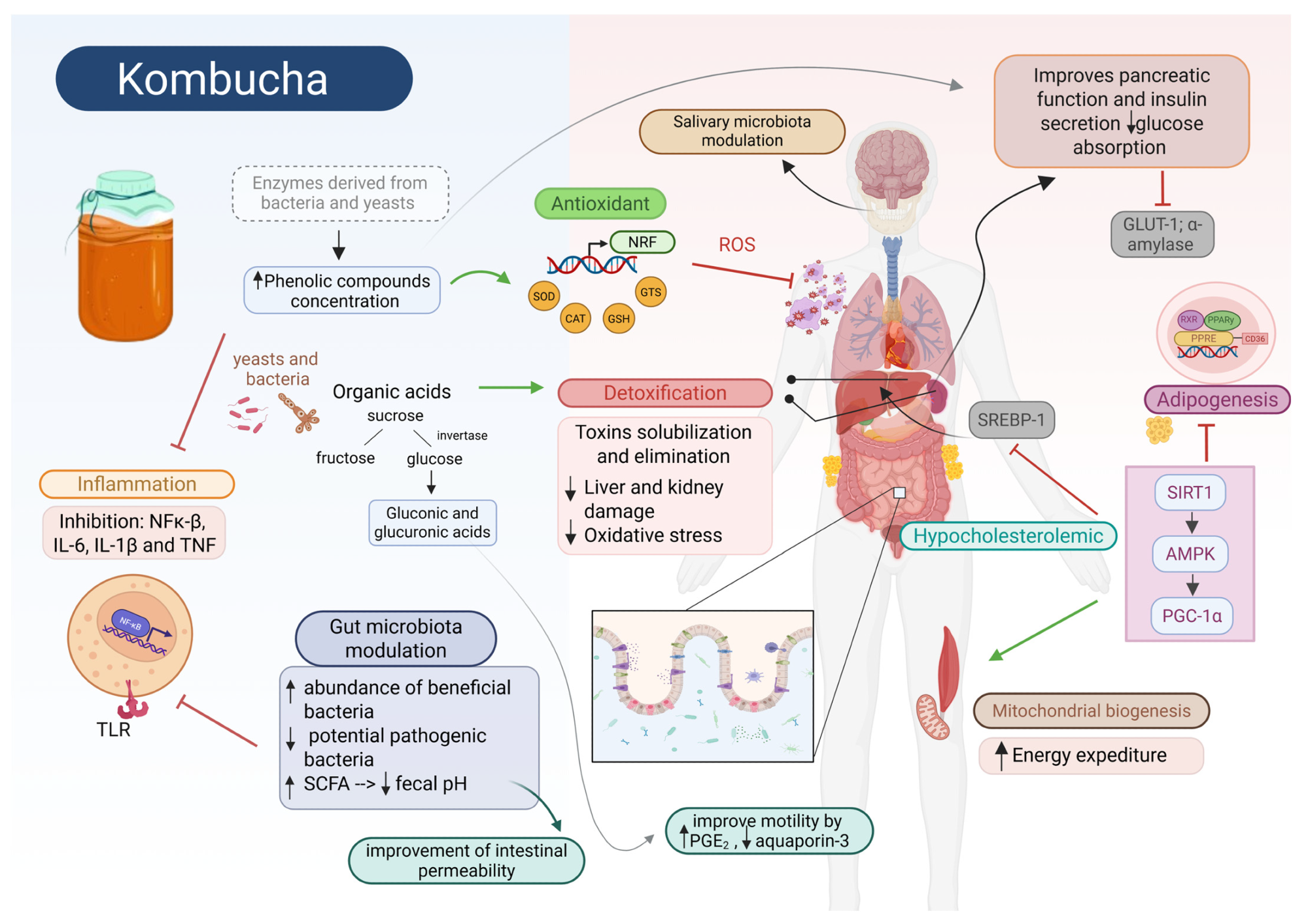Potential molecular mechanisms involved in the promising health benefits of kombucha consumption. The rich composition of kombucha, including organic acids and phenolic compounds, provides potent antioxidant and anti-inflammatory properties that influence multiple molecular pathways across organs. Phenolic compounds exert prebiotic effects by modulating the salivary and fecal microbiota, lowering fecal pH, stimulating the growth of beneficial bacteria, and increasing the production of short-chain fatty acids (SCFAs). This enhances gut barrier function and regulates metabolic, immune, and inflammatory responses. Additionally, kombucha’s bioactive compounds exhibit antimicrobial properties, reducing the presence of oral pathogens associated with periodontitis and cavities. In the gut, organic acids enhance motility by stimulating the secretion of prostaglandin E2, promoting peristalsis, and downregulating aquaporin-3, resulting in softer stools and increased volume. Kombucha also activates SIRT-1 and AMPK, suppressing chronic inflammation via NF-κB inhibition, boosting mitochondrial biogenesis and ATP catabolism, while reducing lipogenesis and hepatic cholesterol synthesis—mechanisms associated with improved energy expenditure and anti-obesity effects. Furthermore, it mitigates hepatic fat accumulation by downregulating lipid-related genes (CD36, PPAR-γ, SREBP-1C) and enhancing β-oxidation. Regarding glucose metabolism, kombucha supports pancreatic function, improves insulin secretion, and reduces glucose absorption by inhibiting α-amylase and GLUT1, mediated by its low pH and microbial activity. Its high organic acid content also promotes hepatic and renal detoxification via glucuronidation, enhancing toxin elimination and protecting against oxidative stress. Additionally, kombucha activates NRF2 signaling, boosting antioxidant defenses through increased expression of enzymes like SOD, CAT, and GSH. ↑: increased; ↓: decreased.Potential molecular mechanisms involved in the promising health benefits of kombucha consumption. The rich composition of kombucha, including organic acids and phenolic compounds, provides potent antioxidant and anti-inflammatory properties that influence multiple molecular pathways across organs. Phenolic compounds exert prebiotic effects by modulating the salivary and fecal microbiota, lowering fecal pH, stimulating the growth of beneficial bacteria, and increasing the production of short-chain fatty acids (SCFAs). This enhances gut barrier function and regulates metabolic, immune, and inflammatory responses. Additionally, kombucha’s bioactive compounds exhibit antimicrobial properties, reducing the presence of oral pathogens associated with periodontitis and cavities. In the gut, organic acids enhance motility by stimulating the secretion of prostaglandin E2, promoting peristalsis, and downregulating aquaporin-3, resulting in softer stools and increased volume. Kombucha also activates SIRT-1 and AMPK, suppressing chronic inflammation via NF-κB inhibition, boosting mitochondrial biogenesis and ATP catabolism, while reducing lipogenesis and hepatic cholesterol synthesis—mechanisms associated with improved energy expenditure and anti-obesity effects. Furthermore, it mitigates hepatic fat accumulation by downregulating lipid-related genes (CD36, PPAR-γ, SREBP-1C) and enhancing β-oxidation. Regarding glucose metabolism, kombucha supports pancreatic function, improves insulin secretion, and reduces glucose absorption by inhibiting α-amylase and GLUT1, mediated by its low pH and microbial activity. Its high organic acid content also promotes hepatic and renal detoxification via glucuronidation, enhancing toxin elimination and protecting against oxidative stress. Additionally, kombucha activates NRF2 signaling, boosting antioxidant defenses through increased expression of enzymes like SOD, CAT, and GSH. ↑: increased; ↓: decreased. 4 - Antolak H, Piechota D, Kucharska A. (2021)