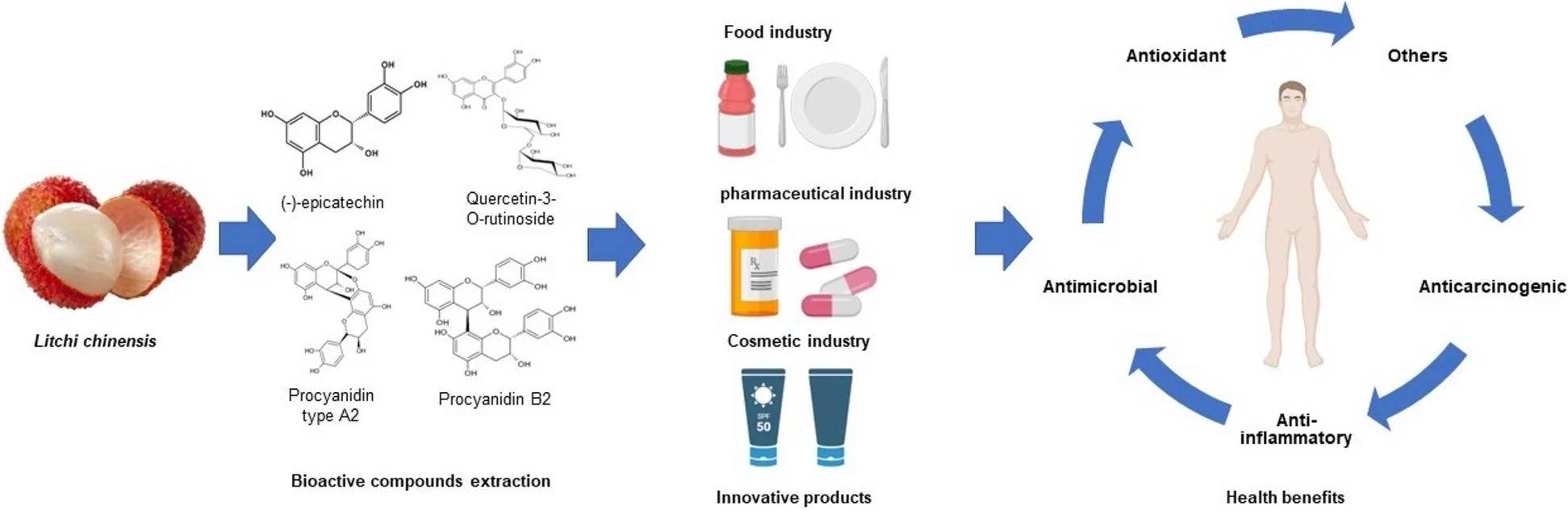 Lychee (Litchi chinensis) is a tropical Sapindaceae fruit that is native to China and widely cultivated throughout Asia, Africa, and the Americas. Lychee is rich in numerous bioactive molecules with antioxidant, anti-inflammatory, antimicrobial, and anti-cancer properties, some of which include epicatechin, procyanidins, and anthocyanins. It also provides polysaccharides, vitamins, and minerals such as potassium, which contribute to its nutritional and nutraceutical profile. As a result, lychee-derived compounds have been widely studied for their potential therapeutic applications.1
