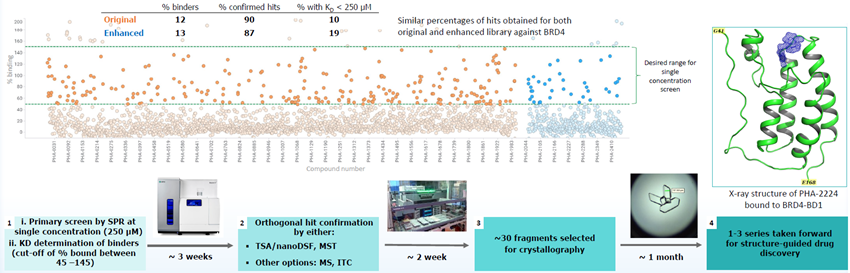 • A comparison between new and original fragments was performed using SPR and found a similar hit rate, with higher-quality fragments.