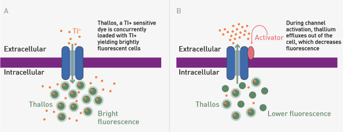 Fig 1. Thallium Flux Snapshot Assay Principle. A) The loading step B) Compound activation of a GIRK leads to efflux of thallium (Tl-) and decreased fluorescence signal. Image Credit: Image courtesy of Sivakumar, M et al., in partnership with ELRIG (UK) Ltd.
