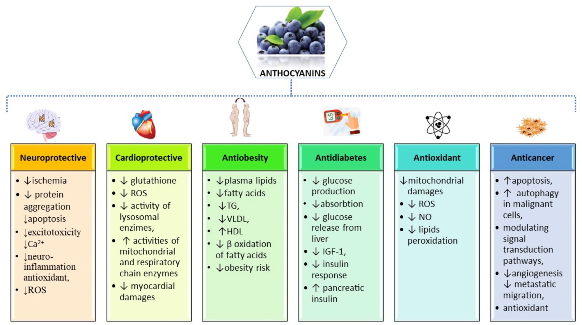 Summarized scheme of the most important pharmacological properties and molecular mechanisms of action of anthocyanins.5