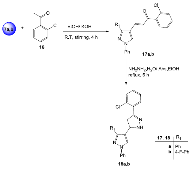 Preparation of the pyrazole chalcones 17a,b and bipyrazoles18a,b.