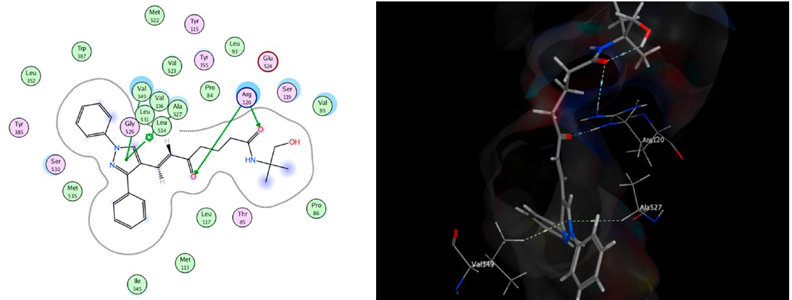 Cyclization to pyrazolines and fusion with a quinoline scaffold improved both potency and COX-2 selectivity. Molecular docking corroborated the experimental findings, identifying compound 14b as the most active through key interactions with Arg120, Arg513, Ser119, Val349, and Ala527 within the COX-2 active site.