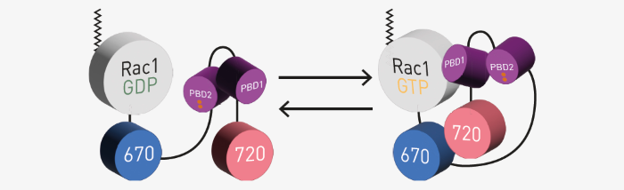 Figure 1 shows a diagram of the NIR FRET Rac1 biosensor.3 It takes advantage of the molecular switch nature of small G-proteins. In the active GTP-bound state, binding of the p-21 binding domain (PBD), derived from p21-activated kinase 1, to Rac1-GTP occurs very easily.