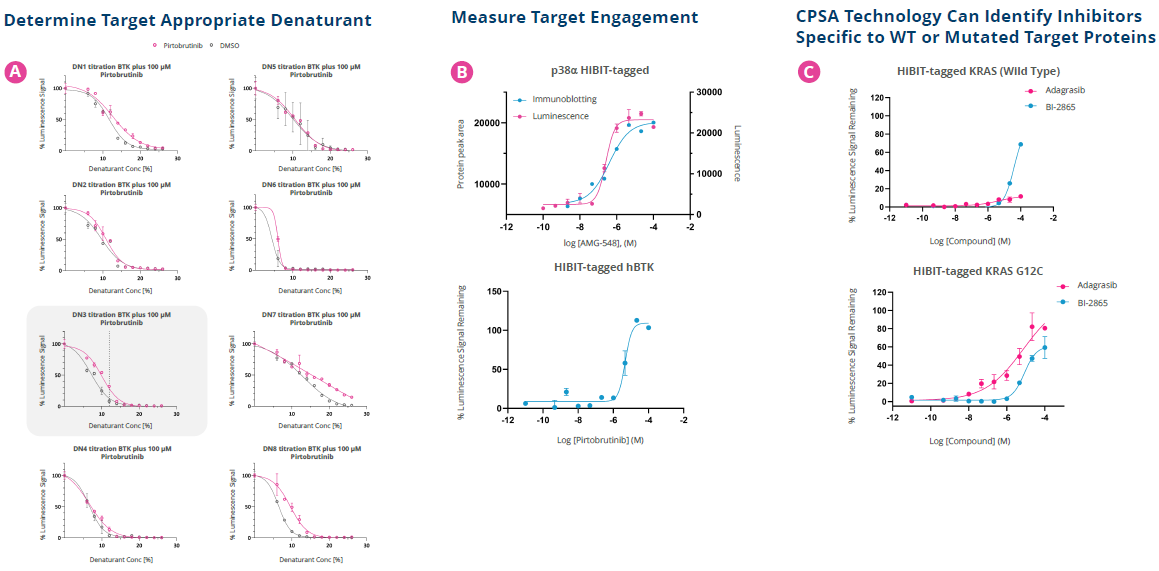 Figure 4. Application of CPSA to multiple cellular targets. Lysates were generated from HeLa (p38) or HEK cells (BTK & KRAS) overexpressing HiBiT-tagged target proteins. For each target, the optimal chemical denaturant type and concentration was determined. [A] shows an example of this for p38. Assays were run in 96-well (p38) or 384-well (BTK & KRAS) microtiter plates with the appropriate denaturant. Protein binding was measured via the Nano-Glo® HiBiT Lytic Detection System. [B] Target appropriate control compounds were screened in concentration response to determine pXC50s. There was parity between XC50s independent of the detection technology used. [C] Two inhibitors of KRAS were screened against HiBiT tagged WT protein or the G12C mutation. Adagrasib is specific for the KRAS G12C mutation and BI-2856 is a pan-RAS inhibitor. CPSA differentiated between the two, with target engagement absent for Adagrasib in the WT cell lysates. Image Credit: Image courtesy of Paulina Chorobik et al., in partnership with ELRIG (UK) Ltd.