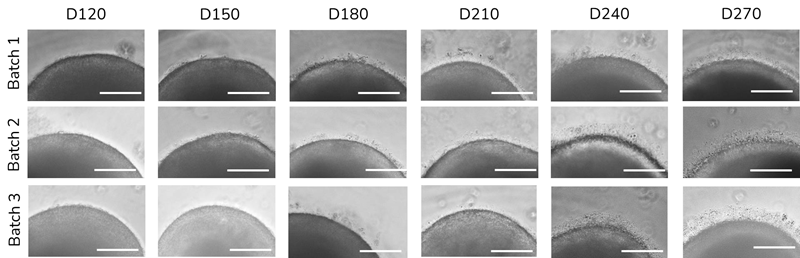 Batches of 100 ROs were monitored over the differentiation timeline at days 120, 150, 180, 210, 240, and 270.