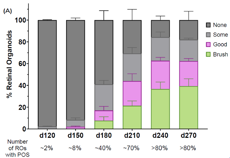 This study established the timeline for the development of POS in wild-type iPSC-derived ROs, as measured by bright field appearance and protein expression profiles across multiple large-scale batches.