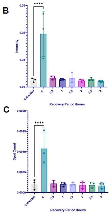 Figure 3. Sorbitol SG disassembly dynamics in U-2 OS cells. (A) U-2 OS cells were treated with sorbitol (400 mM, 1 hour), after which the media was replaced to return cells to basal conditions for 0.5 – 3 hours. Cells were immunolabelled with G3BP1 (green) and dyed with Hoechst (blue) and CellMask (red) (scale bar = 100 μM). Stress granules were induced and subsequently disassembled within 0.5 hours of sorbitol removal. This is shown in quantification of (B) relative G3BP1 spot intensity, (C) average number of G3BP1 spots per cytoplasm area, and cytoplasmic G3BP1 spot area (not shown). Statistical analysis: one-way ANOVA with Dunnett’s multiple comparisons test (**** = p< 0.0001). Image Credit: Image courtesy of Daisy Maiden et al., in partnership with ELRIG (UK) Ltd.