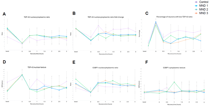 Figure 5. Sorbitol time series to establish stress recovery dynamics in genetic MND mutant motor neurons. Motor neurons were treated with sorbitol (300 mM, 1 hour) after which the media was replaced to return cells to basal conditions for 0.5 – 3 hours. Cells were immunolabelled with G3BP1, TDP-43, MAP2, and dyed with Hoechst, and subject to single-cell analysis. Stress response phenotypes were observed in control and MND lines in response to sorbitol treatment, as shown in the 0-hour recovery condition. Dynamic recovery profiles are observed across (A) TDP-43 nuclear/cytoplasmic ratio (a higher ratio indicates increased relative localization to the nucleus, a decreased ratio indicates increased relative localization to the cytoplasm), (B) TDP-43 nuclear/cytoplasmic ratio normalized to mean baseline ratio for each cell line, (C) the percentage of neurons with low TDP-43 ratio (defined as Median + 2*MAD), (D) TDP-43 nuclear texture, (E) G3BP1 nuclear/cytoplasmic ratio, and (F) G3BP1 cytoplasmic texture. Statistical analysis: two-way ANOVA with mixed effects analysis. Image Credit: Image courtesy of Daisy Maiden et al., in partnership with ELRIG (UK) Ltd.