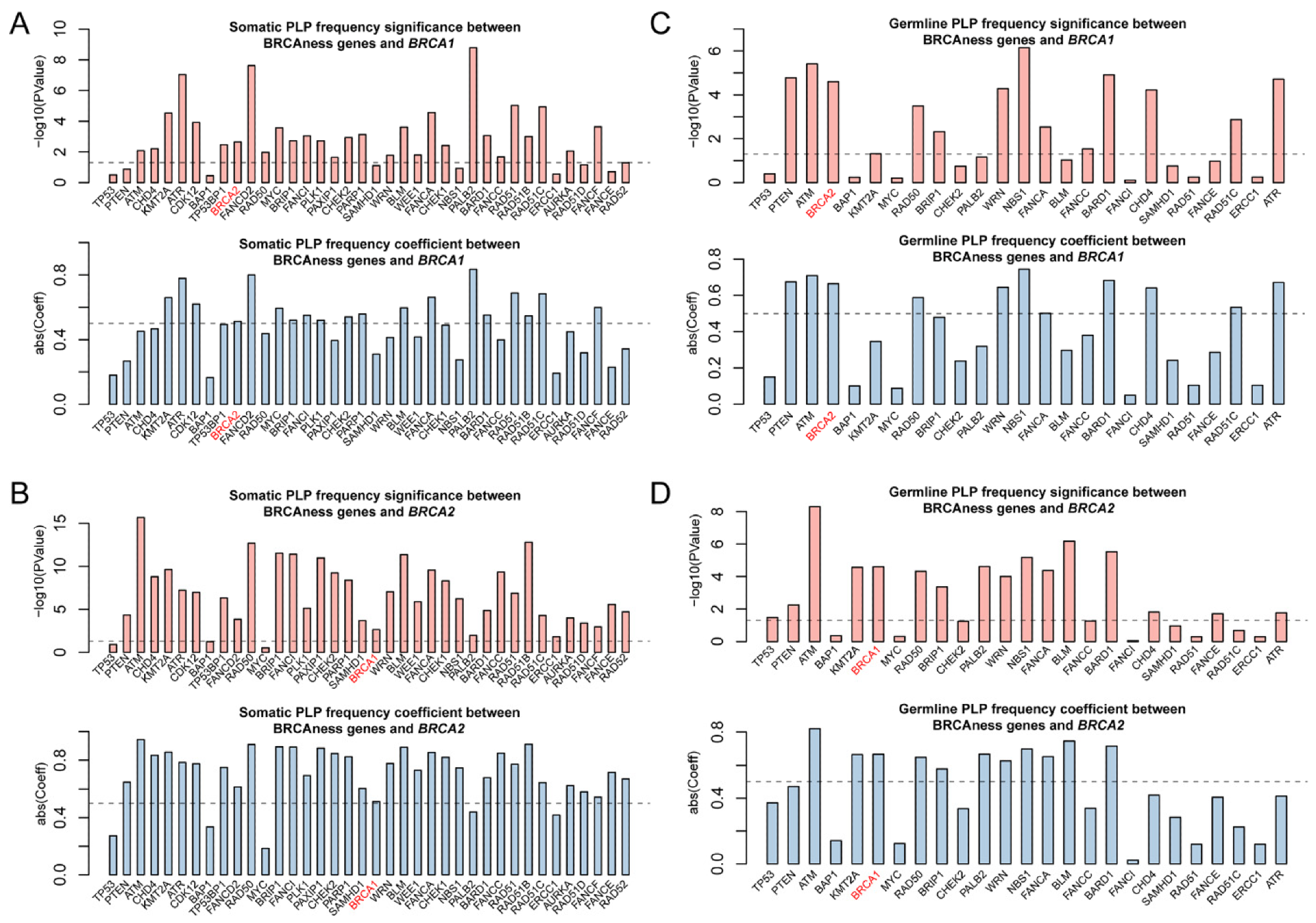 Correlation of pathogenic variation of BRCAness genes across 33 cancer types. (A,B) Significant correlation for the frequencies of somatic and germline pathogenic variants between the individual BRCAness gene and BRCA1. (C,D). Significant correlation for the frequencies of somatic and germline pathogenic variants between the individual BRCAness gene and BRCA2. Pairs with a p-value < 0.05 are regarded as significant. Pairs with an absolute coefficient greater than 0.5 are considered as significantly correlated.2