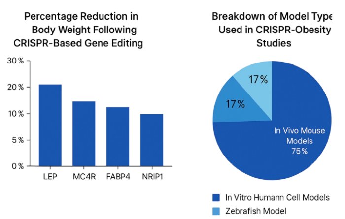 The bar graph indicates that gene edits for LEP, MC4R, and FABP4 produced the most effective weight reduction, highlighting hormonal and metabolic targets as promising avenues. The pie chart reveals an over-reliance on rodent models (75%), which limits translational confidence.