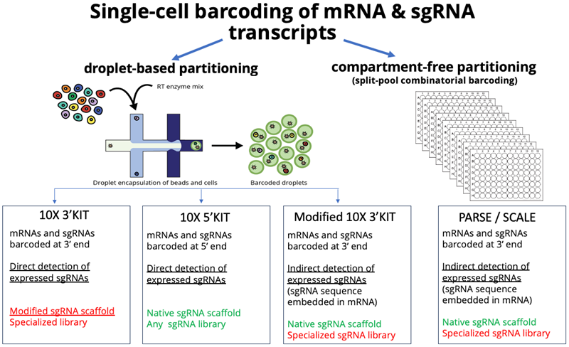• Single-cell barcoding of mRNA and sgRNA transcripts is used to uniquely label transcripts in/from each single cell.