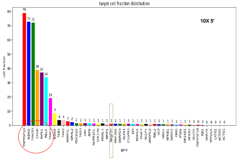 • In all four methodologies, a disruption of the TNFα response was observed by the sgRNAs targeting the TNFα receptor. The highest level of disruption was detected with the 10X 5’ kit, where the TNFα response was abrogated entirely in three out of four cases.