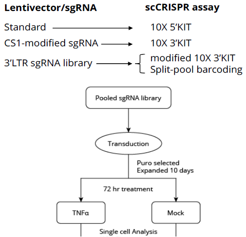 Here, we directly compare two widely used scCRISPR partitioning technologies: droplet-based encapsulation (10x Genomics) and combinatorial split-pool barcoding (Scale Biosciences). Using four parallel screens targeting ~200 genes involved in the TNFα response, we evaluated three lentiviral vector designs (10X-CS1, CROP-seq, and a standard sgRNA vector) across both droplet-based and split-pool workflows in HEK293-Cas9 cells.